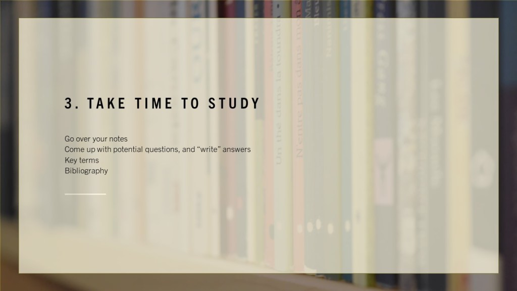 One of the most helpful phases of comps prep for me was study time. I finished reading a few weeks before the exams which gave me time to study. Obviously, you don’t need to learn anything by heart since you’re allowed to use all your notes, articles, books, and scribbles during the exam, but study nonetheless. Go over your notes (especially the ones that you worked on longest ago); return briefly to the texts that you felt unsure about and give them a second glance/read, and think some more about connections between the texts.